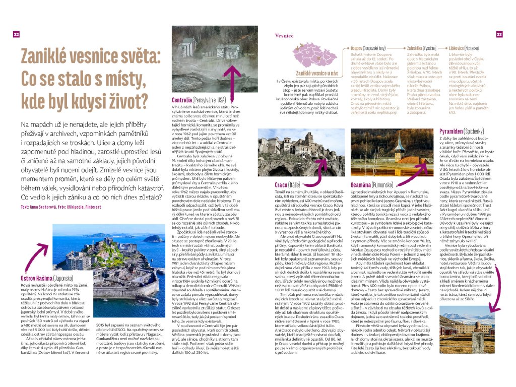 A teď už vzhůru na nové číslo, které patří vesnicím. Nejprve si se sociologem Janem Sládkem popovídáme o minulosti, současnosti i budoucnosti českých venkovů a o tom, proč je z pohledu sociologů důležité se venkovem analyticky zabývat. Od sociologie se přesuneme do raného středověku a podíváme se na to, jak žili naši slovanští předci. A možná vás překvapí, že se v jejich vesnici život zase tolik nelišil od toho našeho. Čeká nás i odkrývání příběhů, které stojí za vznikem názvů jednotlivých českých vesnic – ty běžně odkazují na dávné osadníky, povahu krajiny a přírodní jevy či zaniklá řemesla. Chybět nebudou ani články o zaniklých vesnicích nebo o tom, jak Praha postupně pohlcovala jednotlivá předměstí a okolní obce a dala tak vzniknout „Velké Praze“.