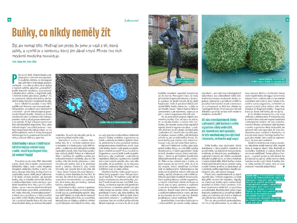 vítejte v laboratoři Nového Prostoru. Nejdříve si popovídáme s Christosem Satratzemisem, nadějným vědcem českého původu, který aktuálně působí v ústavu zaměřeném na jaterní nemoci ve francouzském Štrasburku. Podíváme se také na to, jak se krev naučila zachraňovat životy, k čemuž přispěli pokrokoví lékaři, rozličné experimenty i druhá světová válka. Nebudou chybět ani články o masu, které vzniká z živočišných buněk pěstovaných v kontrolovaném prostředí, nebo o tom, co nás Hollywood naučil o vědě a proč na tom záleží. Že laboratoř nemusí být jen ta se spoustou zkumavek a s mikroskopem, ukazuje článek o Jerzym Grotowském, vousatém pánovi v ponču, provokatérovi a jedné z nejvýznamnějších osobností divadla 20. století– se svým Divadlem Laboratoř hledal podstatu divadla a našel ji v jednoduchosti.